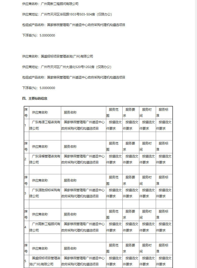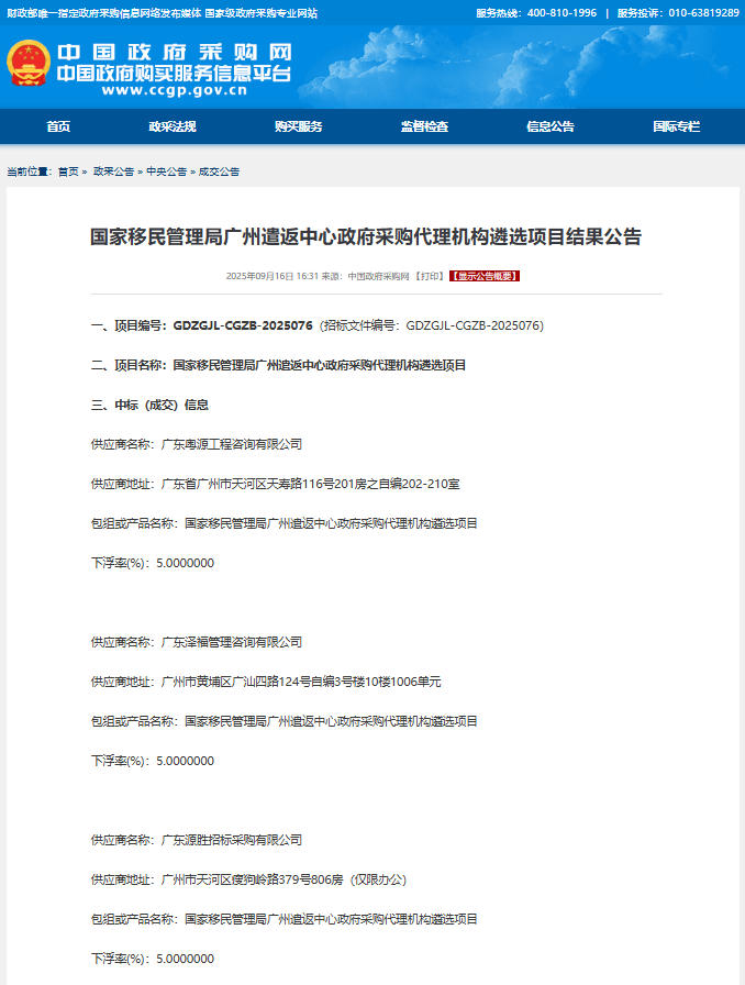 選自網(wǎng)址:國家移民管理局廣州遣返中心政府采購代理機構遴選項目結果公告 http://www.ccgp.gov.cn/cggg/zygg/cjgg/202509/t20250916_25357482.htm